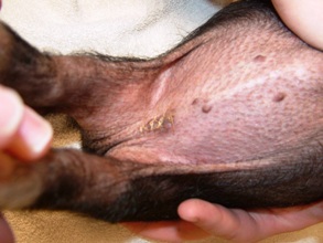 This pot-bellied piglet was spayed by the breeder's veterinarian, and arrived with sutures that needed to be removed. If you notice redness, swelling, oozing, opening of the incision, or an unpleasant odor, please get your piglet seen by a veterinarian immediately!